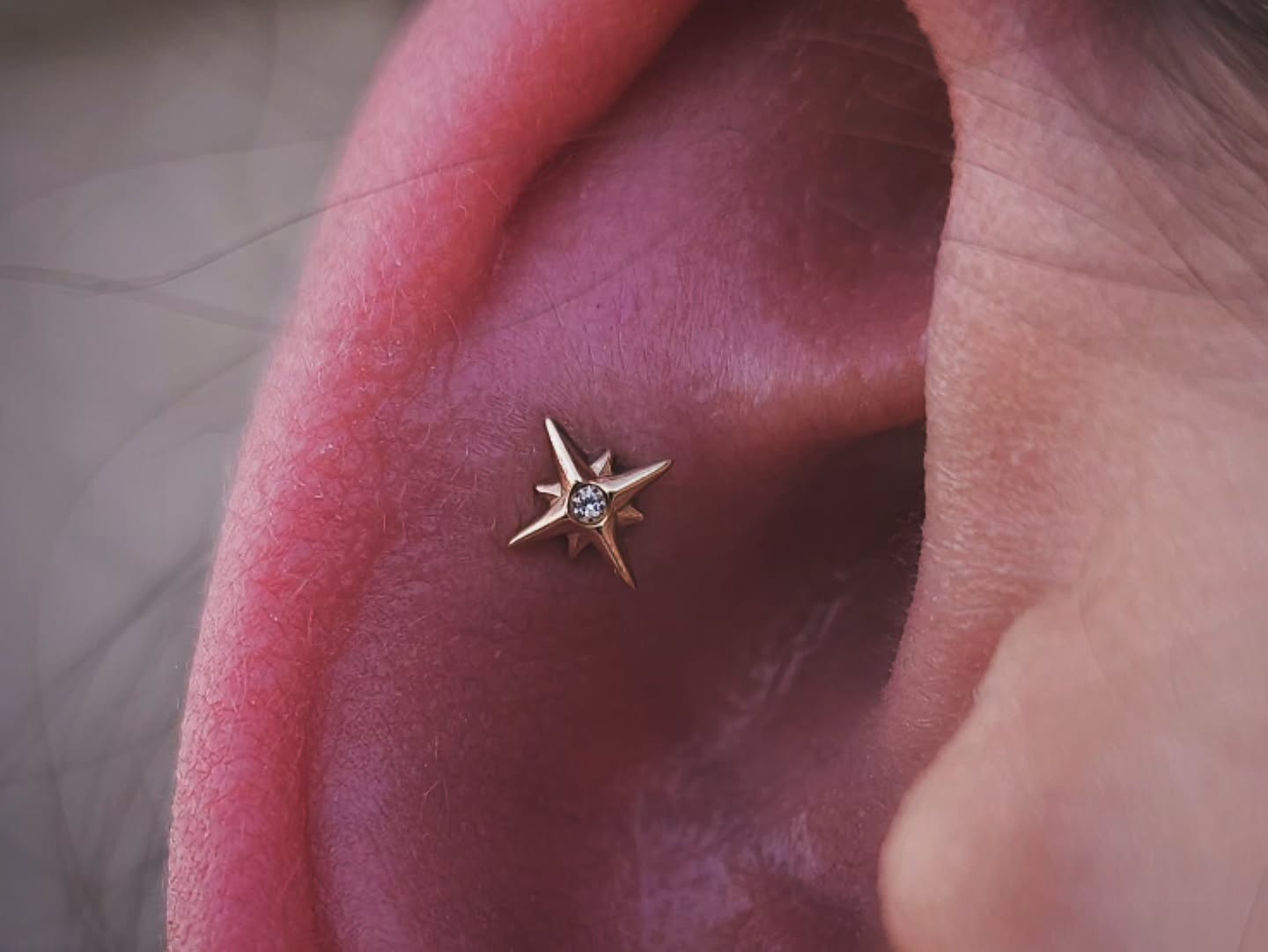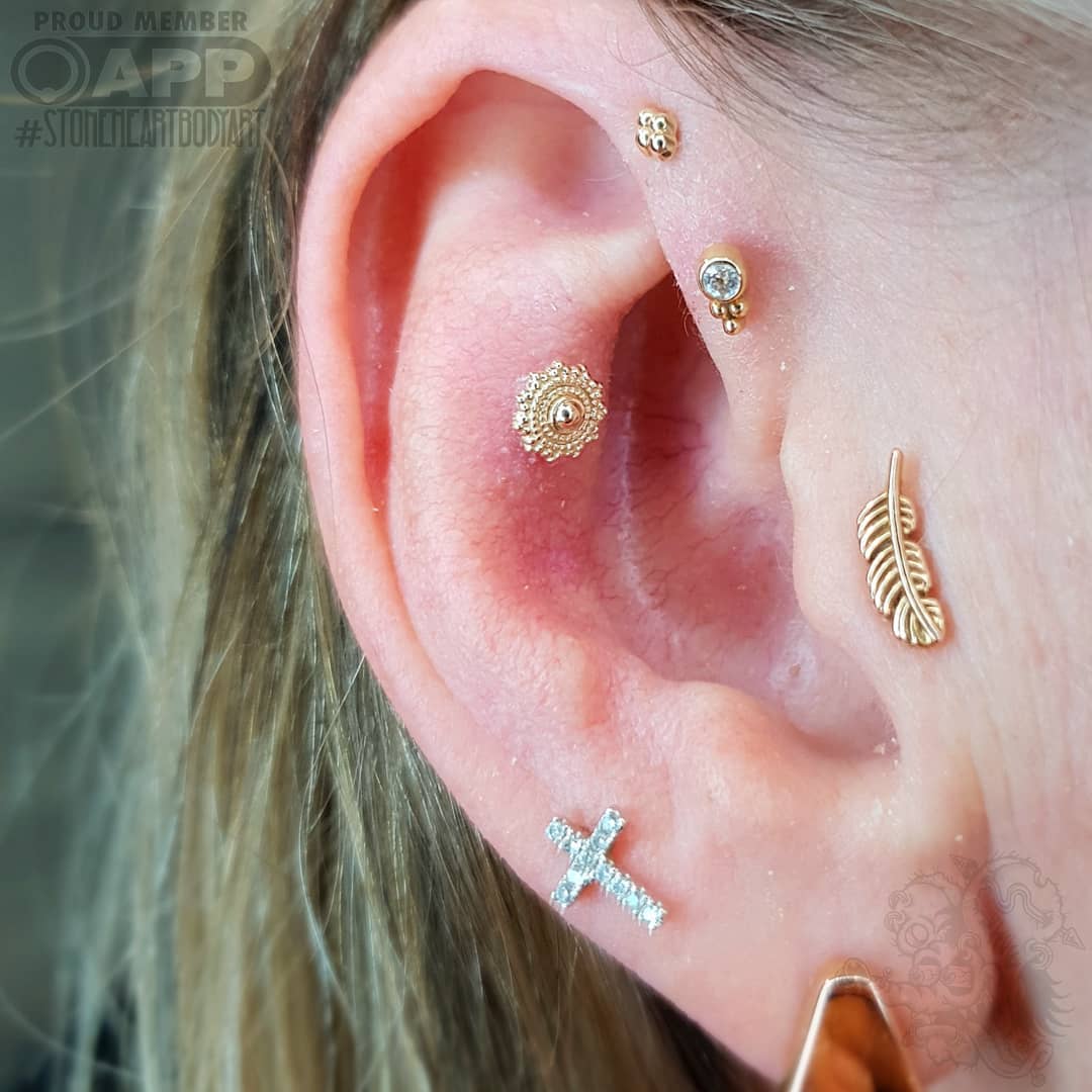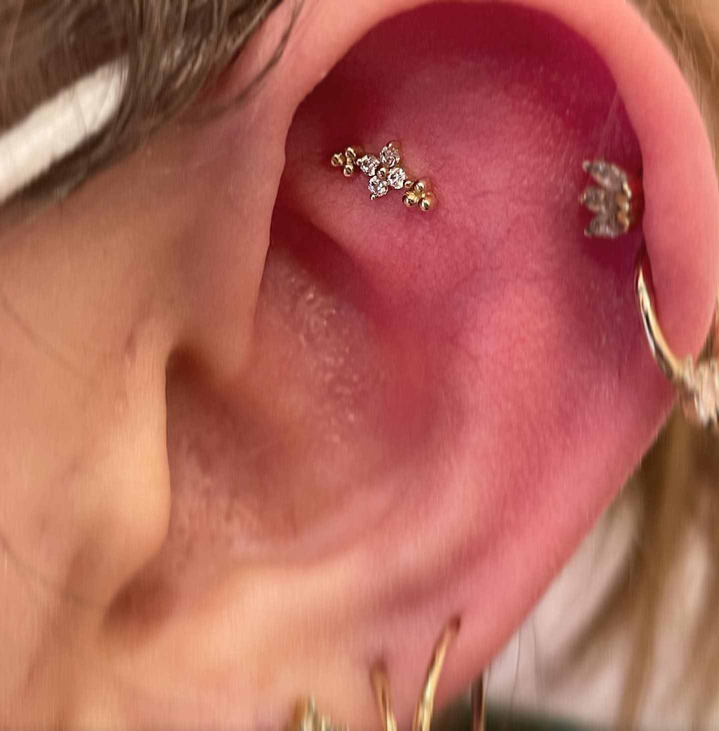 Allandra came in yesterday looking to dress up her ear and we decided on three piercings! She has awesome anatomy so we did a snonch, flat, and tragus piercing (which is unfortunately out of focus.) We plan on maybe adding a second tragus above in the future! For the snonch, we used a 5mm yellow gold star 🌟 and for the flat we used a yellow gold trinity end with peacock opals. All jewelry from @alchemyadornment 💎 Thanks so much Allandra! #alchemyadornment #tranceformations #nanaimo #bc #appmember #safepiercing @safepiercing #goldbodyjewelry #highqualitybodyjewelry #legitjewelry #legitbodyjewelry #legitpiercingslook #snonch #flatpiercing #helixpiercing #piercings #piercing #earpiercings #conchpiercing |