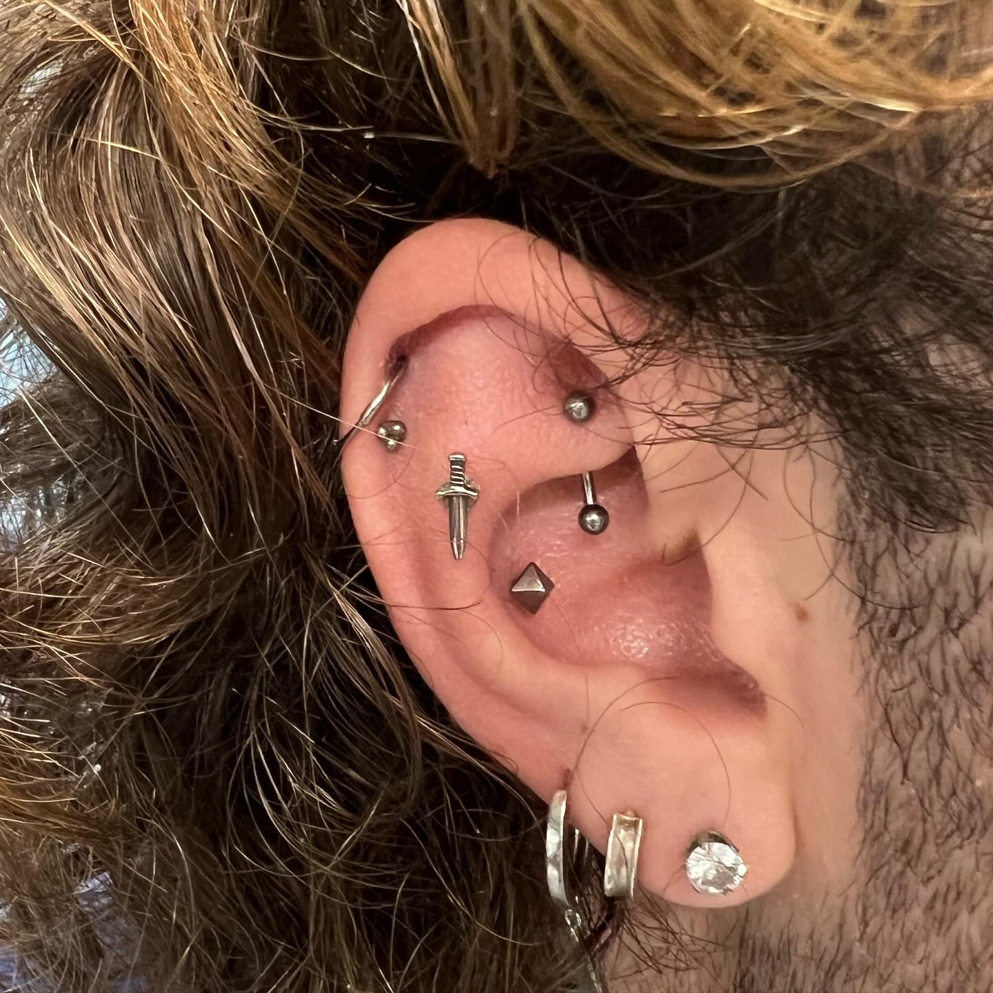 Snonch piercing with ti dagger I did a bit ago at @prixpasadena The client came back to have his eyebrow done so I snagged a pic of this but forgot the eyebrow. Lol. #professionalpiercer #earpiercing #snonch #appmember |