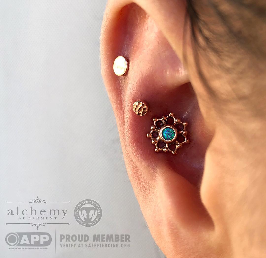 Fresh Conch and #Snonch piercings with some gorgeous rose gold ends by the amazing @alchemyadornment 💎🌟 A Krystal end in her conch, a 3mm hammered disk in her snonch, and we also put in a 4mm disk in her existing helix piercing performed elsewhere. Had a lot of fun with these piercings!! Thanks for the trust Natasha 💕 #conchpiercing #conch #snonchpiercing #piercing #piercings #rosegold #alchemyadornment #tranceformations #goldbodyjewelry #highqualitybodyjewelry #legitpiercingslook #safepiercing #appmember #opal #legitjewelry #fancyasfuck |
