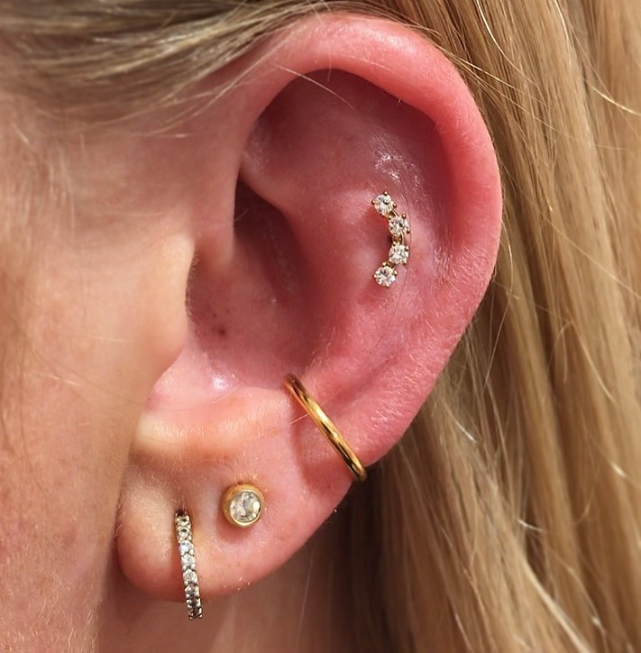Cute wee upper conch with a solid gold arc - you’ll be glad to know we’ve had a good restock on our gold pieces so get yourself down and pierced to be all sparkly in time for Christmas! (Other piercings not by me, but damn they all match nicely!) 🎄 🎅 ❄️ #piercings #conchpiercing #upperconch #scapha #flat #snonch #curatedear #freshpiercing #solidgoldpiercing #bodypiercing #earpiercing #cartilagepiercing #needlepiercing #needlesonly #solidgold #treatyourself #bodymodifcation #piercer #ukpiercer @astridandmiyu |