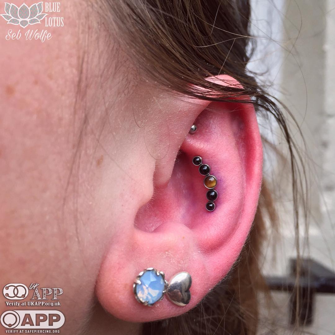 I bloody love everything about this piercing. This lady came down for a traditionally placed conch piercing, but after placing, marking out using the jewellery. She took a look in the mirror and her anti-tragus being so prominent we couldn't see all the jewellery in its glory, so I checked the front and back made sure she had the correct anatomy to do this safely and correctly and we placed this curved arc cluster from @anatometalinc @anatometaluk right on the peak between her snug and conch. I believe I also saw someone call this a 'snonch' ahaha! I like it and I hope this earns the title! #bluelotuspiercing #safepiercing #safepiercinguk #ukpiercer #professionalpiercer #earpiercing #cartilagepiercing #arccluster #anatometal #anatometaluk #anatometalinc #blackonyx #tigereye #cabochon #appmember #ukappmember #snonch #internallythreaded #titaniumjewellery #implantgrade #newcastle #newcastleupontyne |