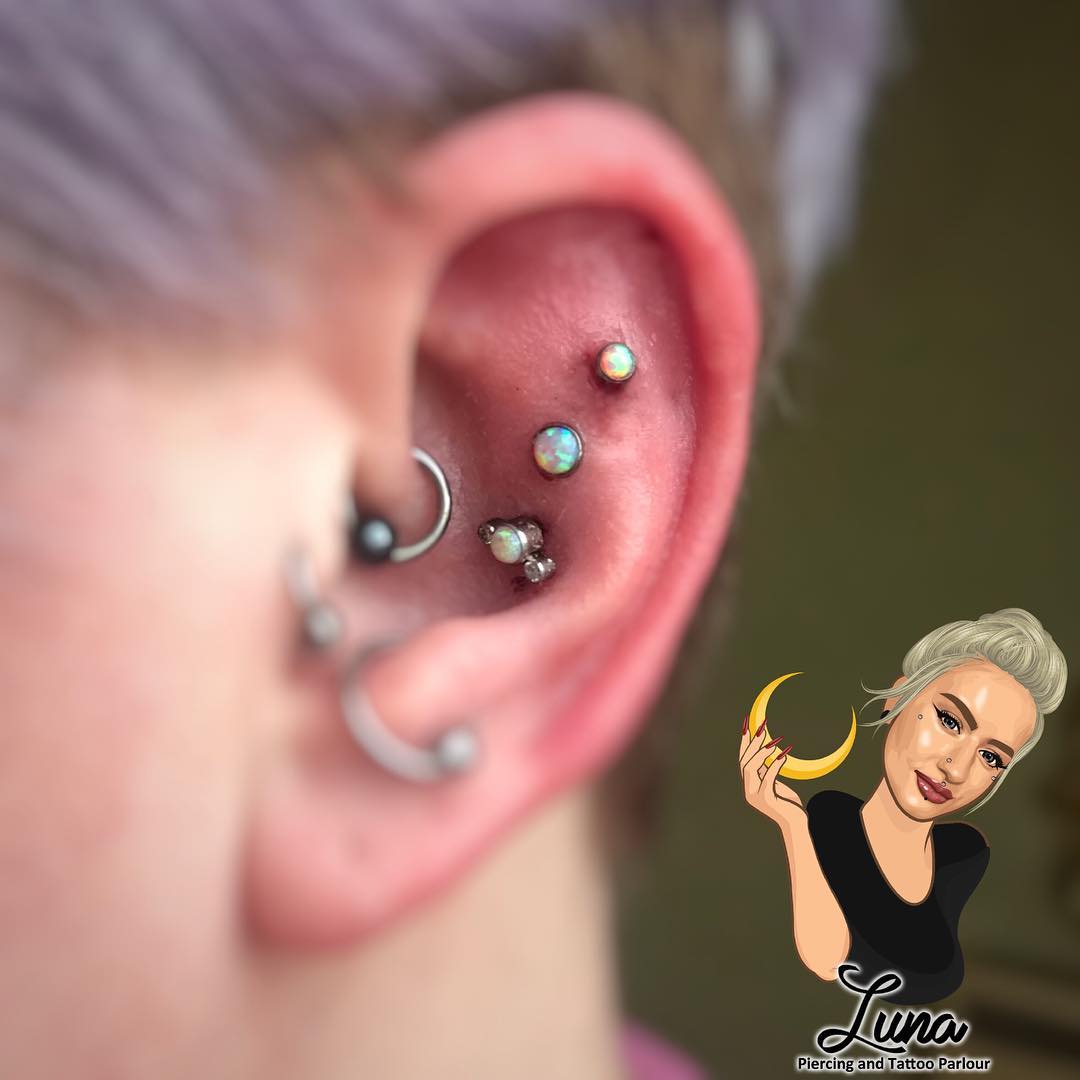 Triple opal piece added to existing conch piercing, high conch and flat helix fresh