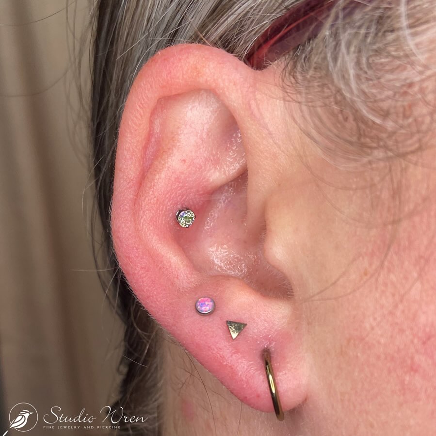 Pictures from when we first pierced it didn’t turn out, so here it is happy and downsized. Remember if you have excess length on any piercing (especially cartilage) we want to get you into a well fitting post to prevent shifting, migration, or snagging.