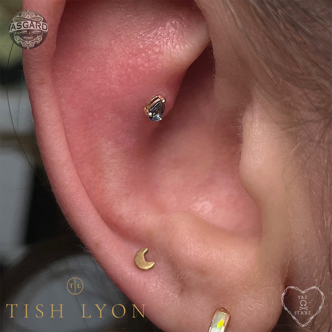 So lush to see Amy again & change over her snonch/contra conch & lobe we did a few months ago 🥰 We saw the 14K Gold Sapphire Tear Drop attachment by @tish_lyon & knew it was the one 🦋paired with a pretty crescent moon 🌙 the start of a stunning set up • Thank you Amy 🖤