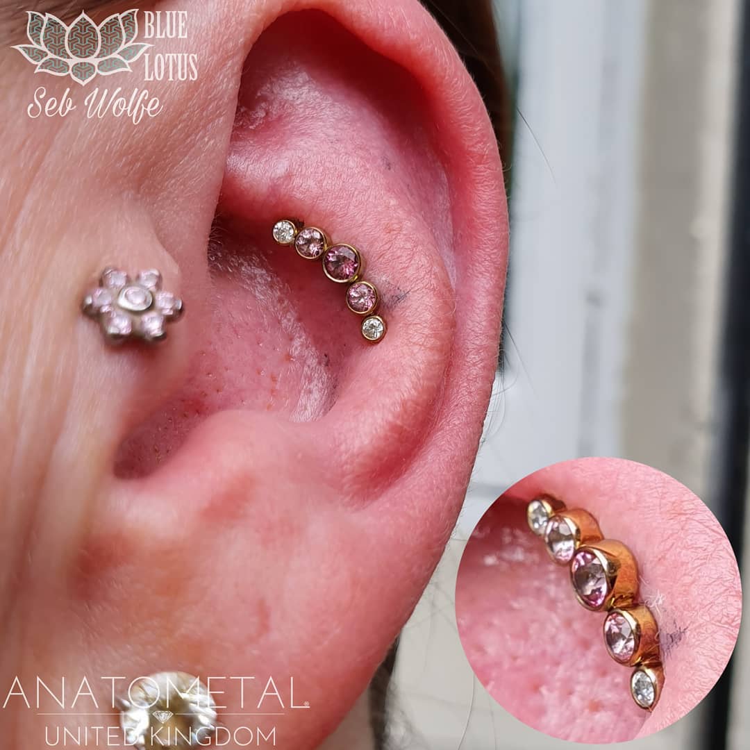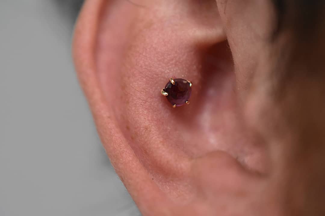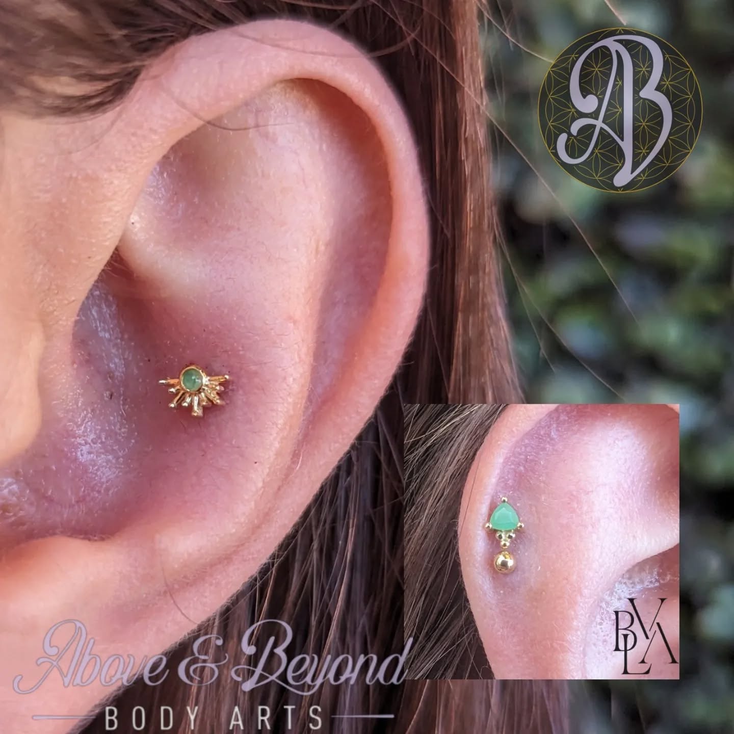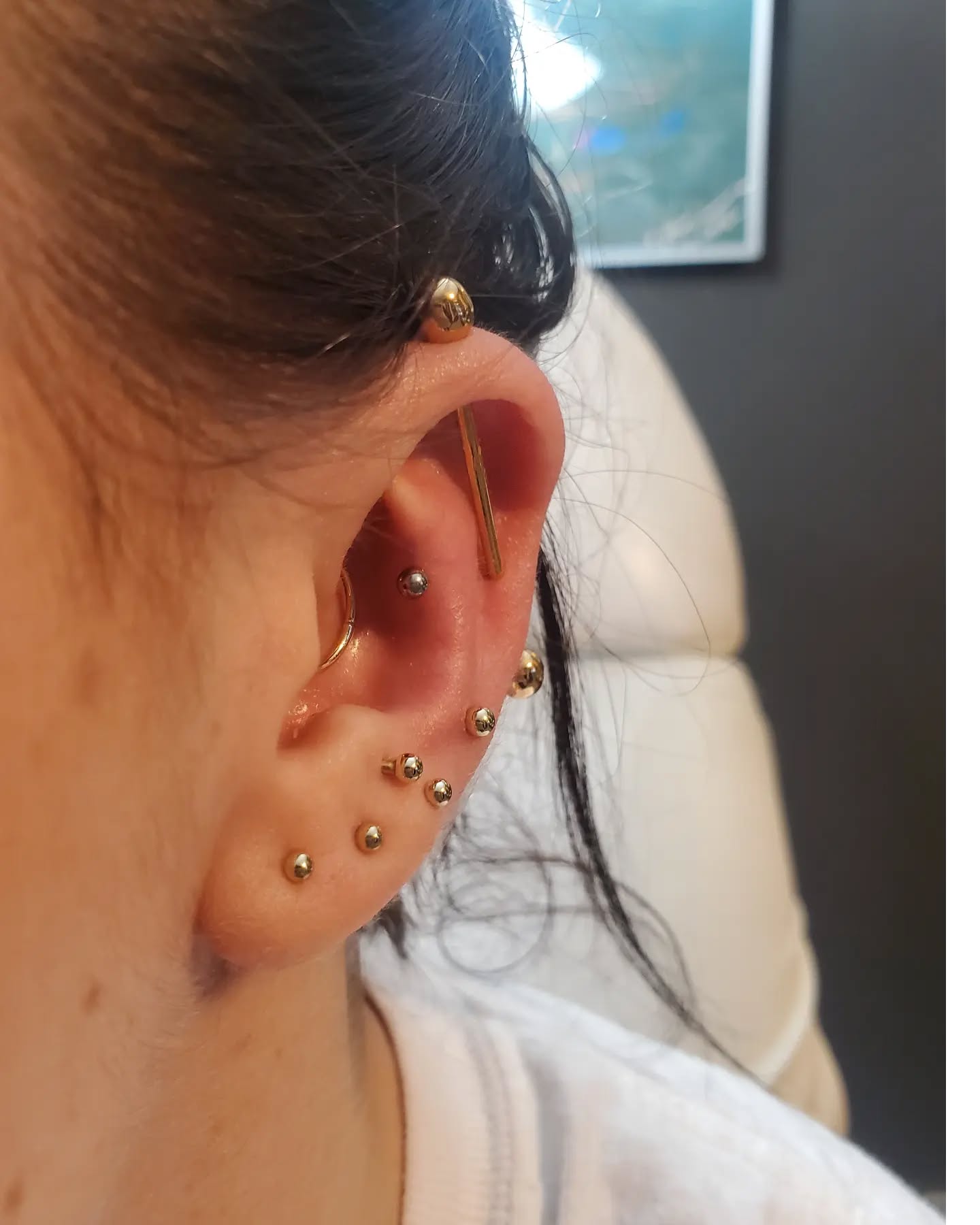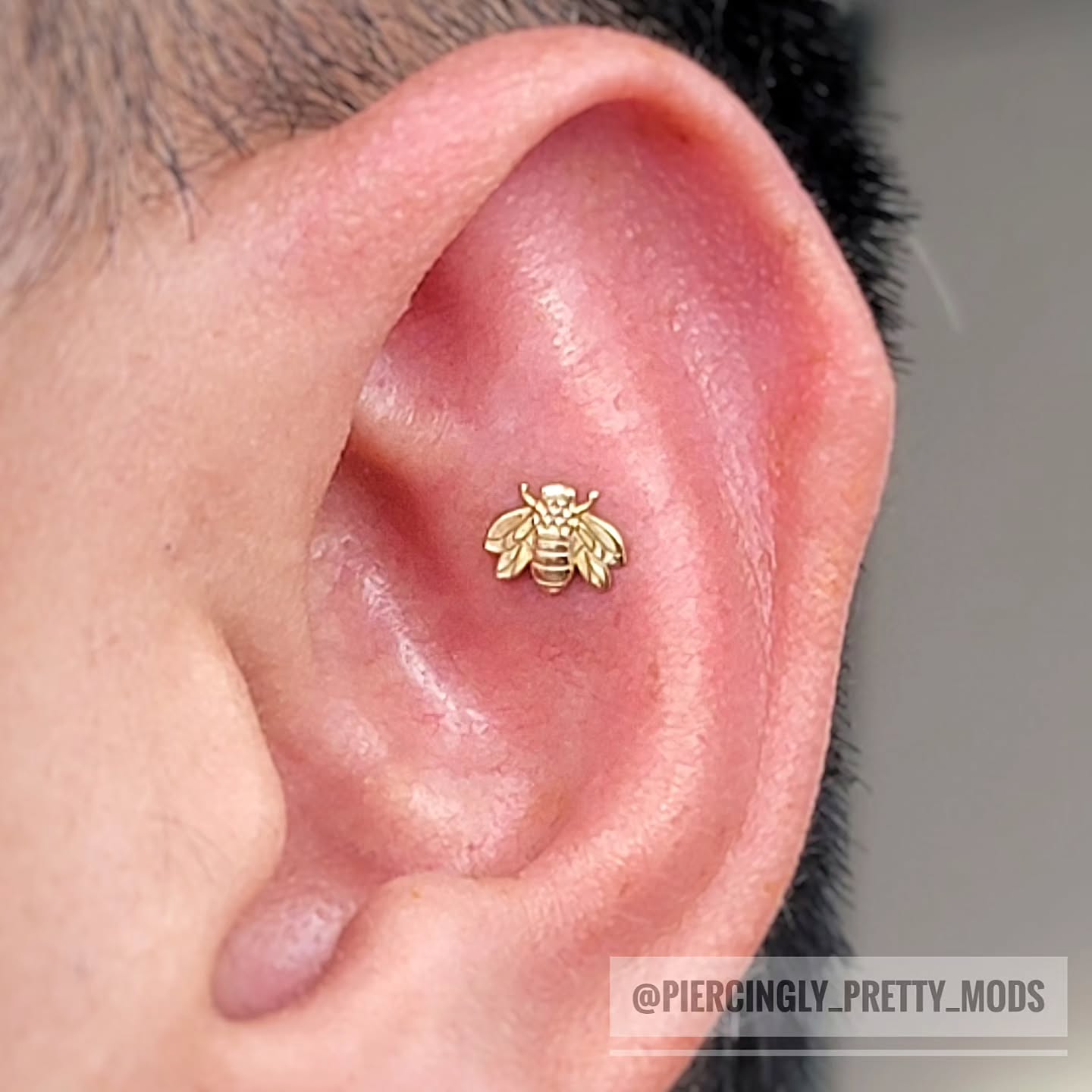 Somewhere between a snug and a conch is the elusive snonch. This placement can be rare. Not everyone has the proper anatomy. So I get very excited when there's a chance to pierce one, especially with my favorite gold end, the honeybee from @bodygems.