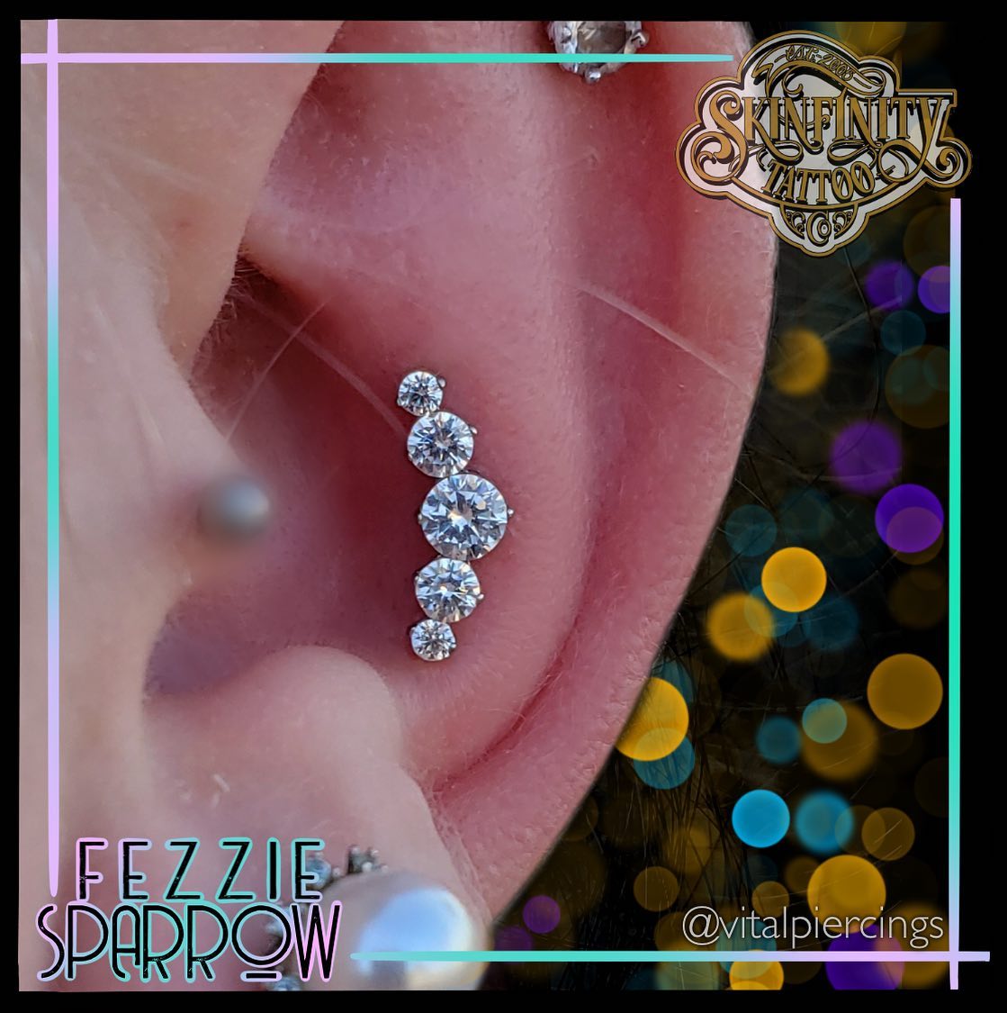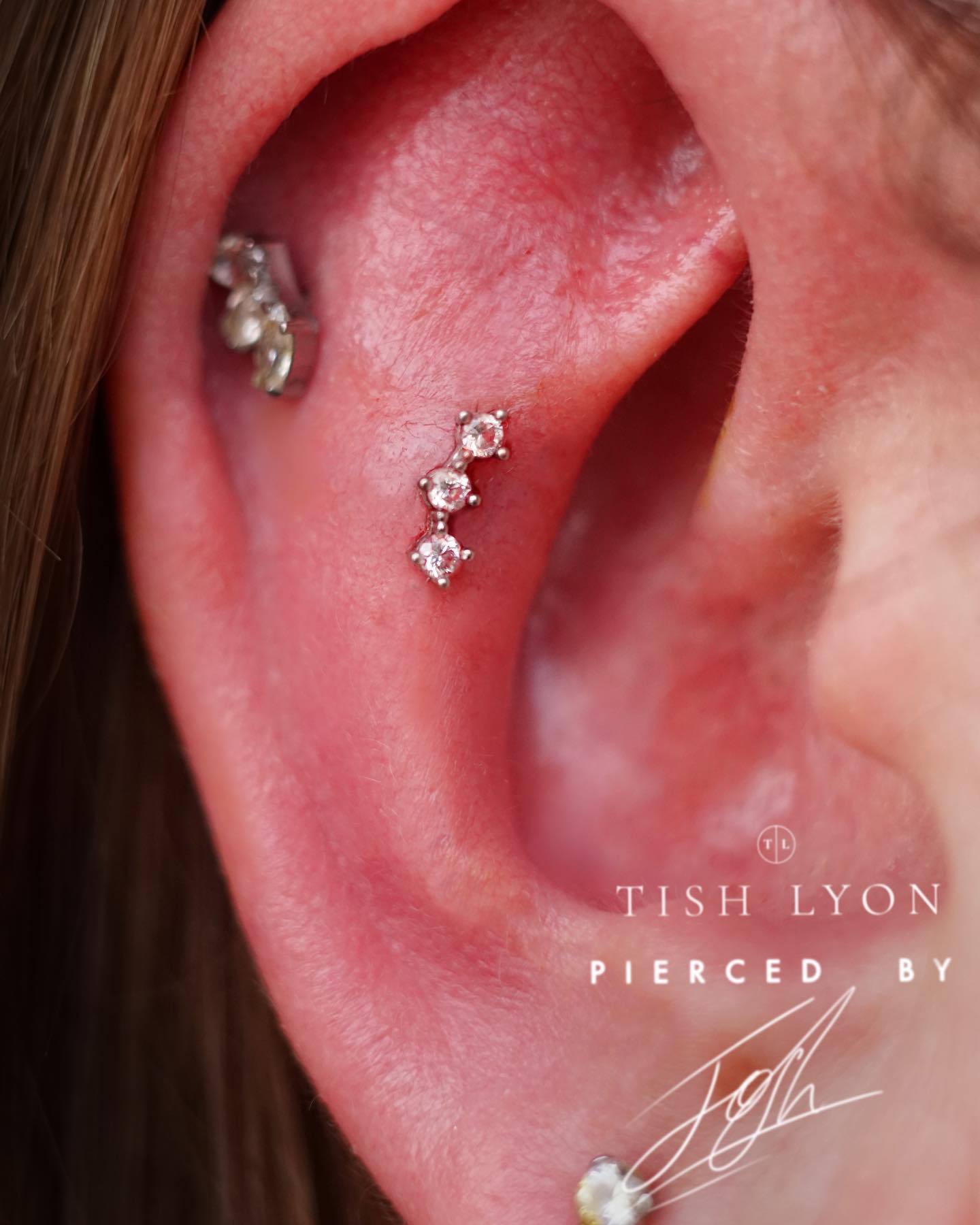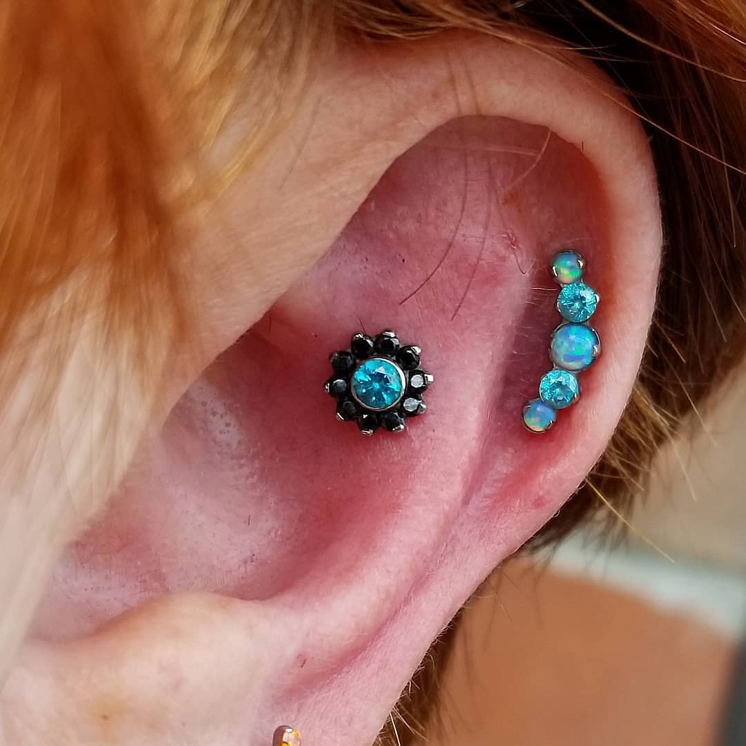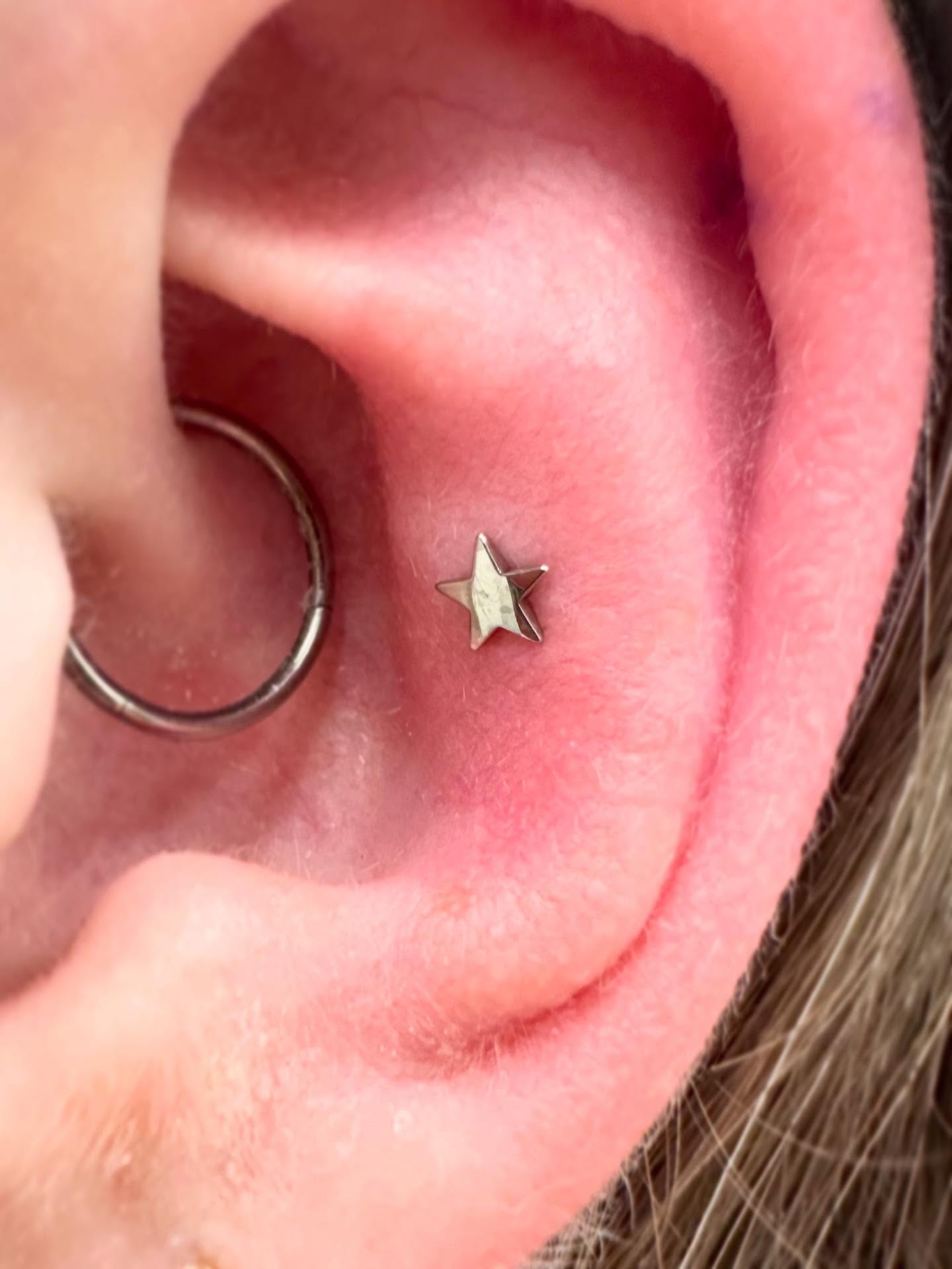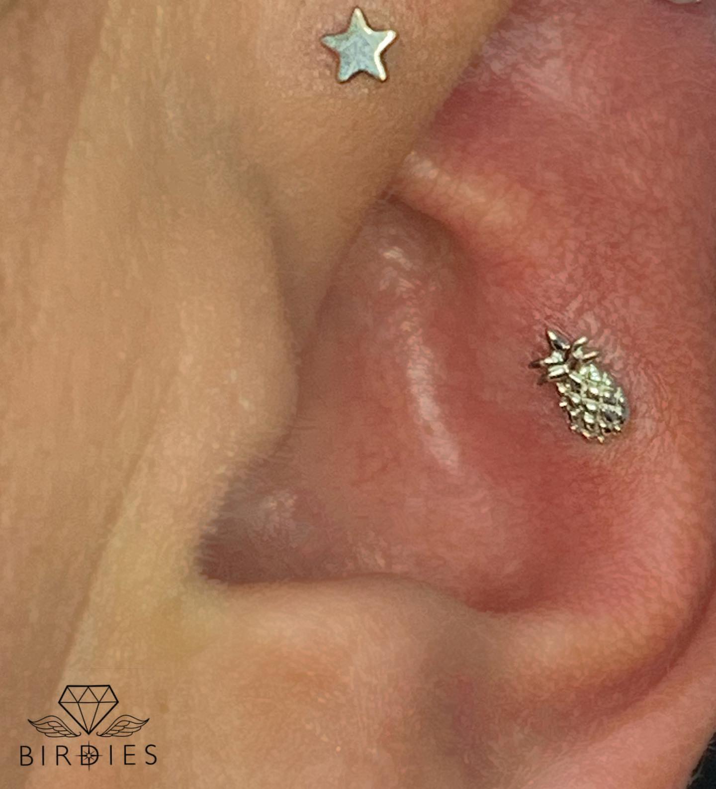 Somewhere between a snug and a conch is the elusive snonch. This placement can be rare. Not everyone has the proper anatomy. So I get very excited when there's a chance to pierce one, especially with my favorite gold end, the honeybee from @bodygems.