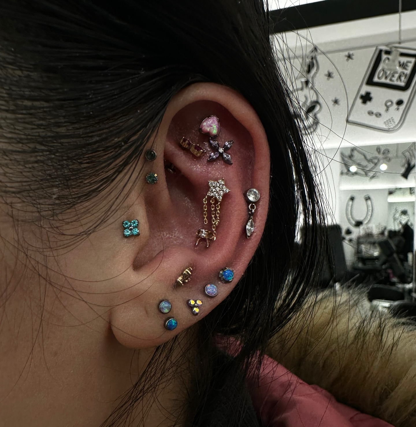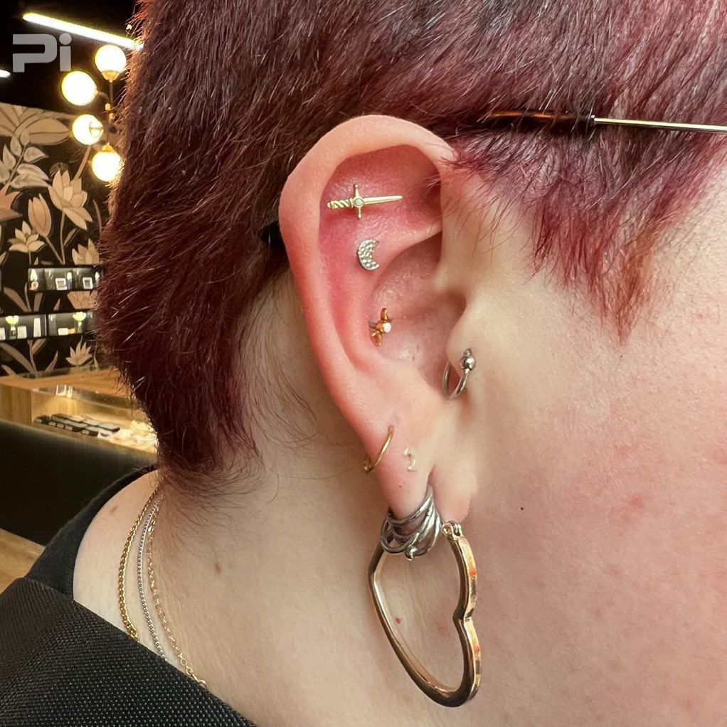 Just a peek at Christine’s party ear curation ❤️ we added a #snonch with a 14k shooting star dangle and a new and properly placed #conchpiercing with a @kiwidiamondjewelry rose gold bow🎀 I’ve lost track of which other piercings I’ve done on her at this point 😅 #invictus #14k #threadless #flatback #professionalpiercer #nycpiercer #cartilagepiercing #conch #daith #flat #helix |